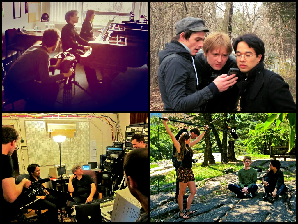 UL: filming the theme music (Beethoven) with Elizabeth DeMio. UR: with Dmitri Levkovich. LL: in the Bronx with record producer Joe Patrych. LR: the accidental first episode with cellist Joshua Roman